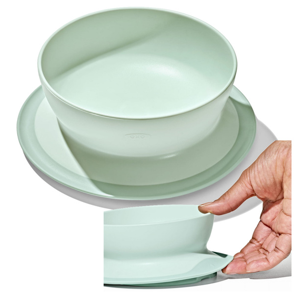 Miseczka OXO tot z serii Stick & Stay w nowym pastelowym kolorze. Jej wysokie, zaokrąglone od wewnątrz ścianki pozwalają na łatwe nabieranie pokarmu na łyżkę. Dodatkowo miseczka OXO tot ma wygodną silikonową przyssawkę, która mocno przylega do powierzchni stołu lub blatu ułatwiając pierwsze próby samodzielnego jedzenia. Kiedy maluch zaczyna poznawać nowe smaki miseczka z przyssawką idealne sprawdzi się, jako pierwsze naczynie Twojej pociechy. Pewnie tkwi na stole i nie ucieka podczas prób nakładania posiłku na łyżeczkę. Dodatkowo przyssawka chroni naczynie przed zrzuceniem ze stołu lub blatu, pozwalając zachować porządek wokół malucha. Docenią ją więc nie tylko dzieci, ale i dorośli. Konstrukcja przyssawki jest łatwa w obsłudze. Rodzic łatwo odessie ją od stołu pociągając za specjalny uchwyt. Jeśli ustawimy go tyłem do dziecka, maluch nie odczepi miseczki samodzielnie. Przyssawka jest odkręcana od talerzyka, dzięki czemu naczynie łatwo i dokładnie umyjemy. Ręcznie lub w zmywarce (na górnej półce).