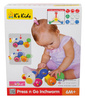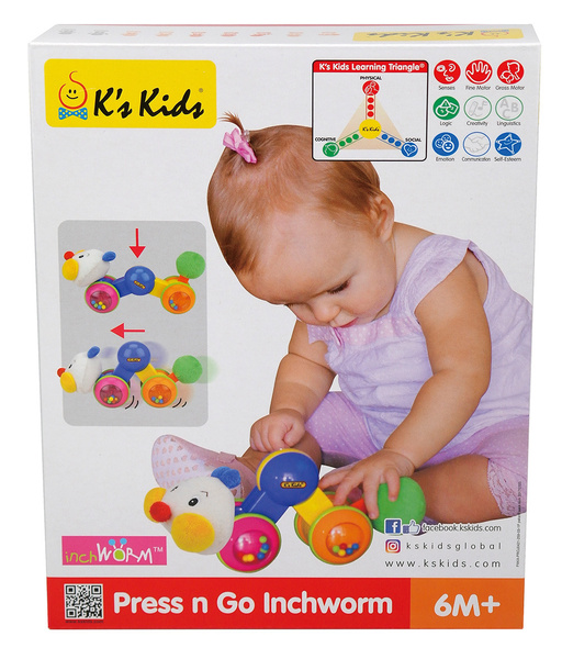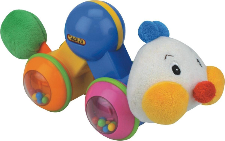 Słodka, kolorowa gąsieniczka, która po naciśnięciu grzbietu jeździ. Posiada piszczący ogonek, obracającą się główkę oraz kolorowe koraliki w kołach, które grzechoczą podczas zabaw. Zabawka posiada również pluszową główkę i ogonek, dzięki czemu sprawdzi się także jako przytulanka.