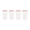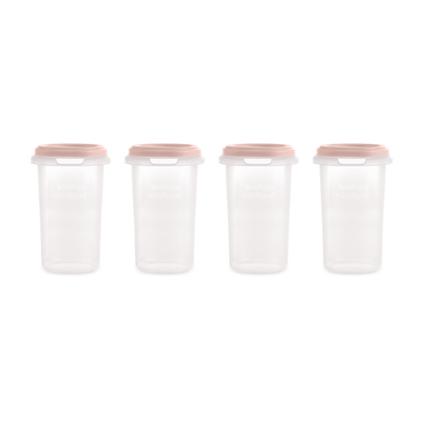 Kompletny zestaw 4 hermetycznych pojemników z podziałką o pojemności 330 ml każdy, z pokrywkami w kolorze miętowym. Szczególnie polecany do przechowywania, podgrzewania, zamrażania lub transportu mleka matki, pierwszej kaszki dziecka, a także wszelkiego rodzaju pokarmów stałych i płynnych.