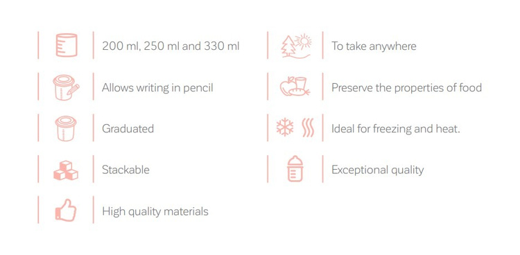 Idealne do pierwszych musów i wszelkiego rodzaju pokarmów stałych, przekąsek aż po desery. Dobrze nadają się do innych płynnych produktów spożywczych, takich jak buliony, czy naturalne soki.
