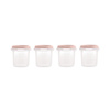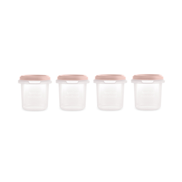 Kompletny zestaw 4 hermetycznych pojemników z podziałką o pojemności 200 ml każdy, z pokrywkami w kolorze cukierkowym. Szczególnie polecany do przechowywania, podgrzewania, zamrażania lub transportu mleka matki, pierwszej kaszki dziecka, a także wszelkiego rodzaju pokarmów stałych i płynnych.