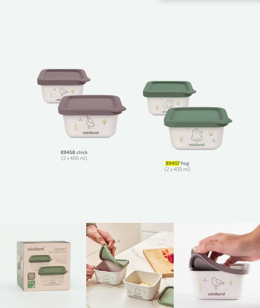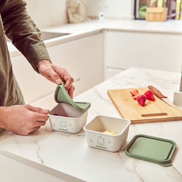 Ten ekologiczny zestaw idealnie nadaje się do przechowywania domowego jedzenia dla niemowląt. Posiada dwa pojemniki na wszelkiego rodzaju pokarmy stałe o pojemności 400ml. Pojemniki są wykonane z wytrzymałych, organicznych materiałów i mają szczelną, silikonową pokrywkę.