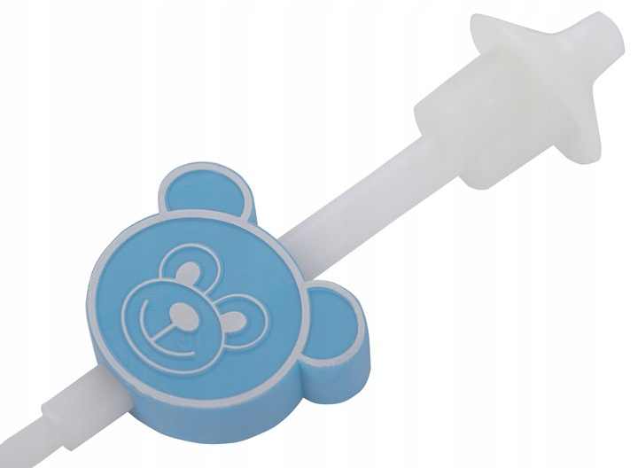 2. W tym położeniu, rurkę doodbytniczą umieścić pod bieżącą wodą tak, aby woda przepływała z grubszej rurki (2) do cieńszej (4) tuż poniżej głowy misia. (Zdjecie 1)