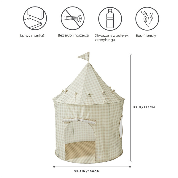 Namiot dla dzieci to idealne miejsce do zabawy, przestrzeń do czytania, relaksu i odpoczynku. Namiot tworzy przytulne i magiczne otoczenie, które dzieci pokochają. Namiot dla dzieci to także świetny element dekoracyjny pokoju dziecięcego, który doda wnętrzu uroku i charakteru. Siateczkowe okna i drzwi można dowolnie odsłaniać i zasłaniać. Namiot został starannie zaprojektowany, aby zapewnić stabilność i wygodę podczas użytkowania. Posiada solidną ramę, która utrzymuje go w stabilnej pozycji, nawet podczas intensywnej zabawy. Dzięki lekkiej konstrukcji namiot można z łatwością przenosić i rozkładać w różnych miejscach. Namiot został wykonany z poliestru pochodzącego z recyklingu. Materiał ten jest zarówno przyjemny w dotyku, jak i odporny na codzienne zużycie.
