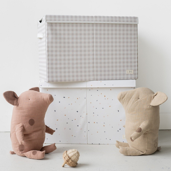 Pudełko zamykane na zabawki to wygodny pojemnik do przechowywania akcesoriów w dziecięcym pokoju. Wyjmowany separator umożliwia stworzenie dwóch przegródek o dowolnej wielkości. Pojemna skrzynia pomieści wiele dziecięcych gadżetów. Pudełko doskonale sprawdzi się do przechowywania książek, zabawek, a także bielizny czy ubrań sezonowych, a pokrywa pomoże ukryć wszystkie te akcesoria w jego wnętrzu. Boki, pokrywa oraz spód pudełka zostały wzmocnione grubą tekturą, dzięki czemu pudełko na zabawki stabilnie stoi i pięknie się prezentuje nawet gdy jest puste.