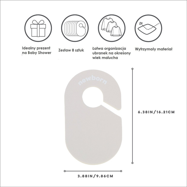 Liczba podziałek: Zestaw zawiera 8 podziałek z oznaczeniami rozmiarów od noworodka do 2T (do 24 miesięcy) w języku angielskim
