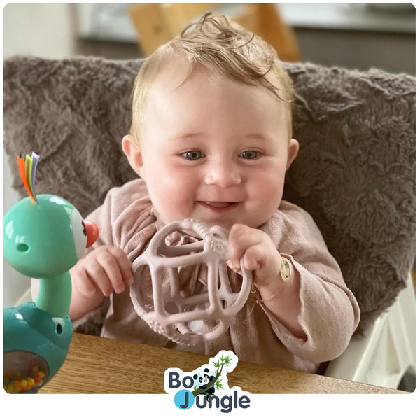 Wyjątkowo lekka, giętka silikonowa piłka gryzak jest ulubioną zabawką niemowląt. Stymuluje zarówno odruch brania, chwytania, zachęca do badania kształtu, wspomagarozwój motoryki, ćwiczy koordynację ręka-oko oraz wspomaga rozwój sensoryczny maluszka. Poza tym sprawdza się doskonale jako gryzak. Łagodzi ból dziąseł, masuje je, stymuluje usta i język dzięki różnym powierzchniom i teksturze. Pozwala dziecku ukoić swędzące dziąsła w trakcie pełnego stadium ząbkowania