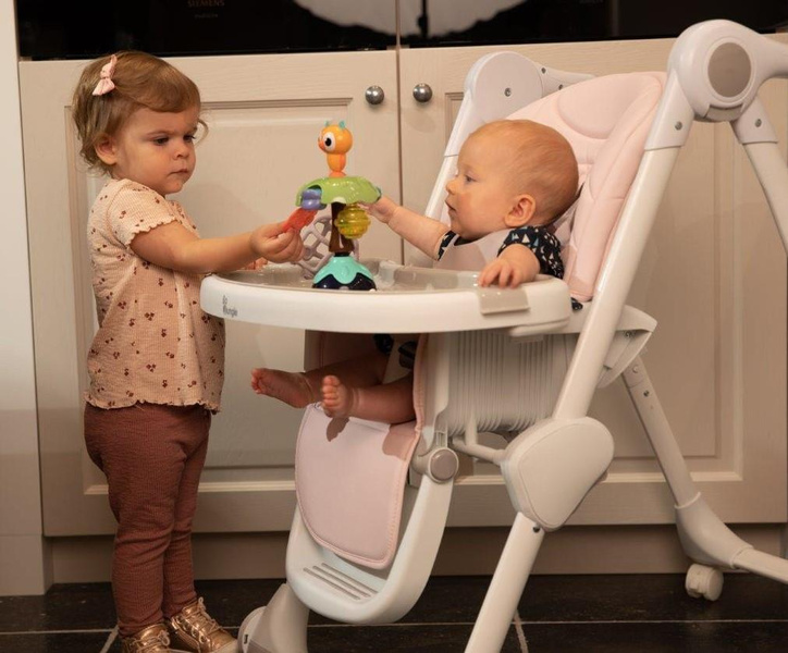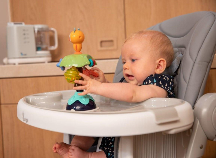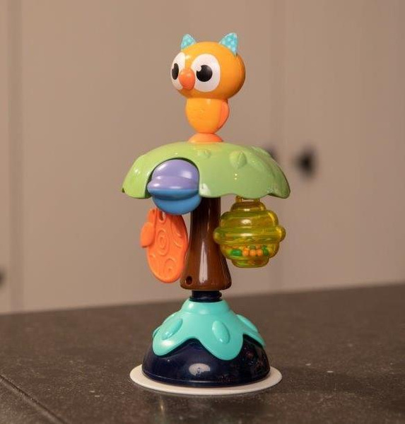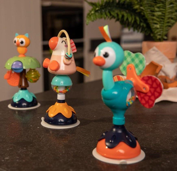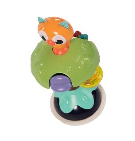 Zabawka może być mocowana do stołu lub blatu krzesełka za pomocą przyssawki, która jest dodatkowo stabilizowana za pomocą dokręcanego elementu zabawki (granatowy kwiatek na kulistej podstawie), dzięki temu pozostaje ona stabilnie w miejscu, gdzie została umieszczona.