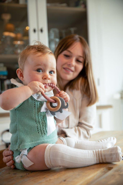 Wspaniały klasyk w nowej odsłonie, gryzak z silikonu i drewna bukowego to wyjątkowo lekka ulubiona zabawka niemowląt.