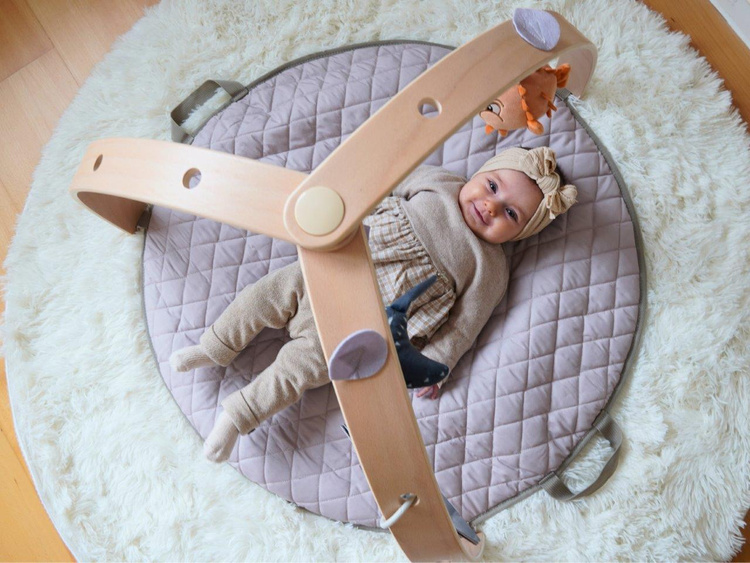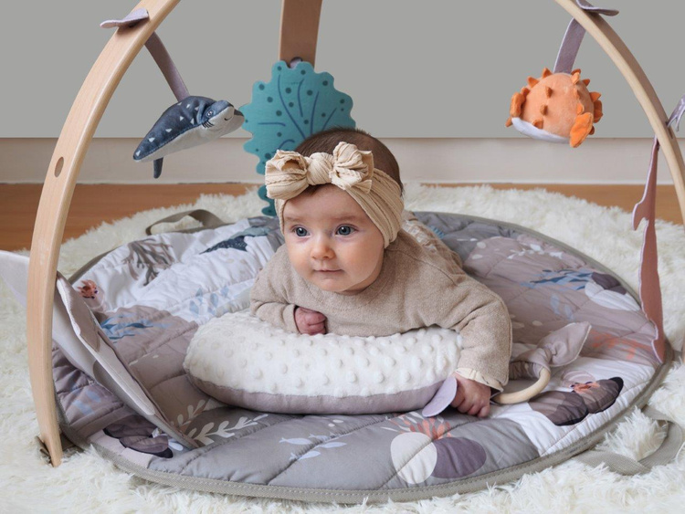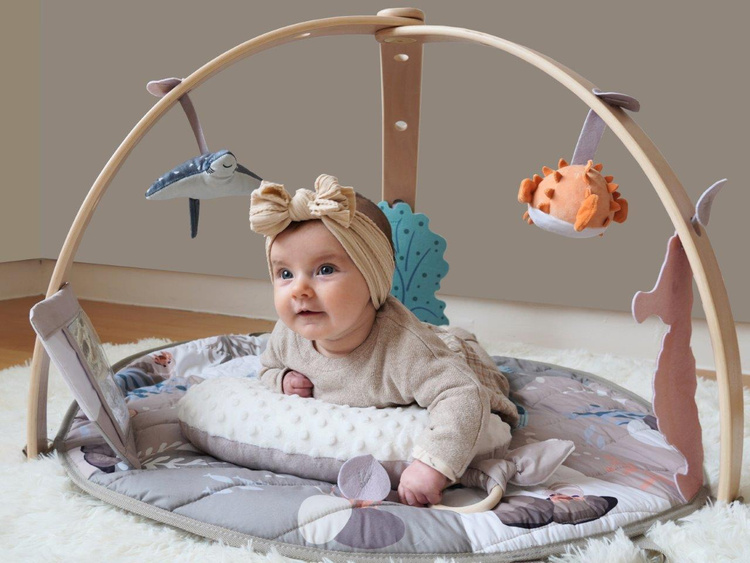 Przedstawiamy pięknie wykonaną matę interaktywną z drewnianymi łukami Ocean Bliss belgijskiej marki Bo Jungle. Zapewnij swojemu maluchowi spokojną zabawę na wygodnej i komfortowej macie. Łuki są wykonane z wysokiej jakości drewna i siłownia jest wyposażona w wiszące pluszowe zabawki. Rozwijają one motorykę i koordynację wzrokowo-ruchową malucha oraz uczą go zależności przyczyna-skutek, zachęcają dziecko do gimnastyki i chwytania wiszących zabawek. Poprzez zabawę wspomaga rozwój zmysłów: wzroku, słuchu i dotyku. Twoje dziecko będzie zachwycone odkrywaniem miękkiej, dwustronnej poduszki i uroczych filcowych figurek po bokach maty, zaprojektowanych w celu stymulowania rozwoju sensorycznego. Mata gimnastyczna zawiera kieszeń z lusterkiem, która służy również jako uchwyt na urocze karty, angażując ciekawość dziecka i pomagając w rozwoju wzroku.
