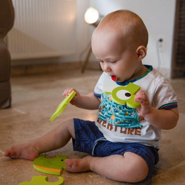 się z 4-ech elementów puzzli, dzięki czemu dziecko uczy się krok po kroku rozwijać umiejętności motoryczne, poznaje i dotyka, rozwiązuje łamigłówki.