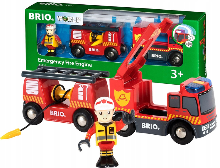 Zestaw zawiera: 1x wóz strażacki, 1x przyczepa z wężem strażackim, 1x figurka strażaka