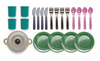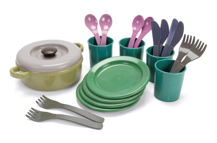 Zestaw obiadowy do zabawy wykonany został w 100% z przetworzonego tworzywa sztucznego. Idealny do zabawy w domu i w ogródku. Z uwagi na proces recyklingu kolory każdego z produktu mogą się różnić. Zestaw zapakowany jest w elastyczną siateczkę i składa się z zastawy na 4 osoby, która zawiera talerzyki, kubeczki, łyżki, widelce, noże oraz z garnek z przykrywką. Teraz każdy maluch może zostać kucharzem i gotować bezkońca!