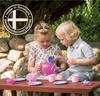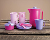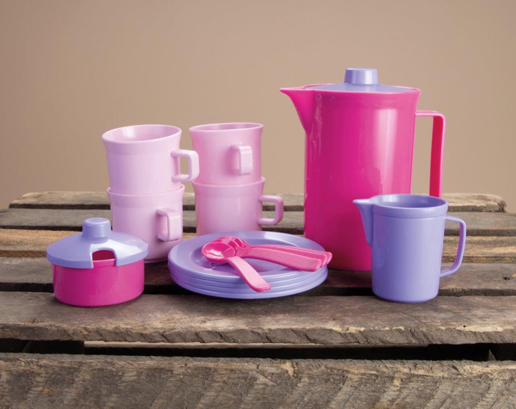 Zestaw kawowy zawiera dzbanek do kawy, 4 filiżanki, talerzyki i łyżeczki w kolorach pastelowego różu, lawendy i fuksji.