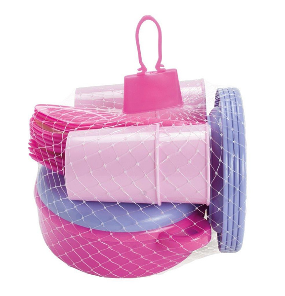 Zestaw obiadowy zawiera garnek z pokrywką, 4 kubki,talerze i sztućce składające się z nowa, widelca i łyżki w kolorach pastelowego różu, lawendy i fuksji.