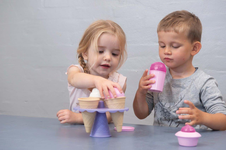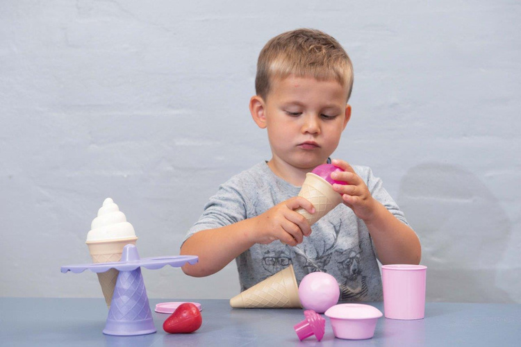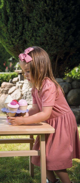 Zestaw lodowy zapakowany jest w elegancki kartonik, zawiera 3 wafelki,kubeczek, różne kulki lodów i rożki, które można łączyć na wiele różnych sposobów. Lody są atrakcyjnie podane na specjalnym stojaku,wszystko w kolorach pastelowego różu, lawendy i fuksji. Dzięki wielu kombinacjom można serwować wiele smaków lodów i przugotować piękne przyjęcie dla lalek i misiów lub bawić się w lodziarnię lub sklep. Idealny również do zabawy w ogrodzie z lemoniadą i ciasteczkami.