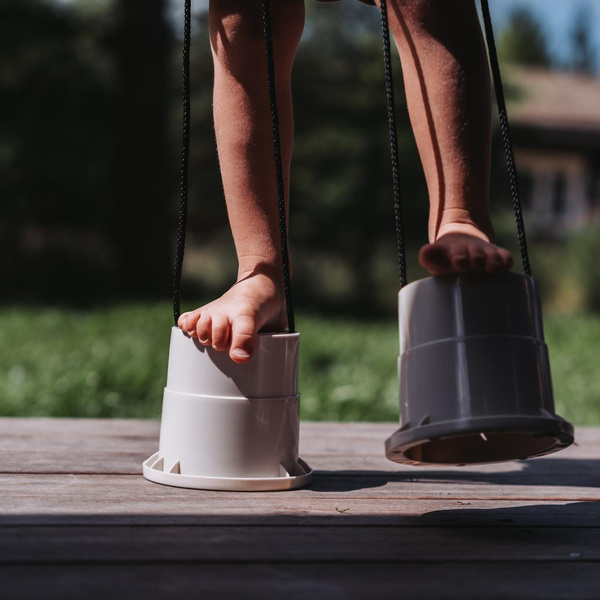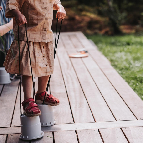 Sztuka utrzymania balansu na szczudłach jest wyzwaniem dla małego dziecka, które ma możliwość swobodnego stawiania na nich stopy, dodatkowo radość sprawia to, iż malec jest kawałek wyżej od ziemi. Do poruszania się angażuje jeszcze ręce. Każde szczudło ma zamocowany sznurek, który pozwala podnosić je do góry razem ze stopą przy każdym kroku. Dzięki tej prostej czynności, zabawa na szczudłach ćwiczy nie tylko nogi i zmysł równowagi, ale również ręce i koordynację ruchową. Zabawka łatwo mieści się w torbie na plażę lub do parku. Można ją znakomicie rozbudować o inne zestawy BIO, które składają się wyłącznie z zabawek wykonanych z nadającego się do recyklingu plastiku organicznego w ładnych, naturalnych odcieniach.