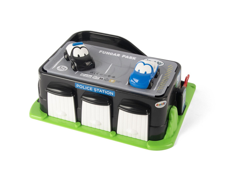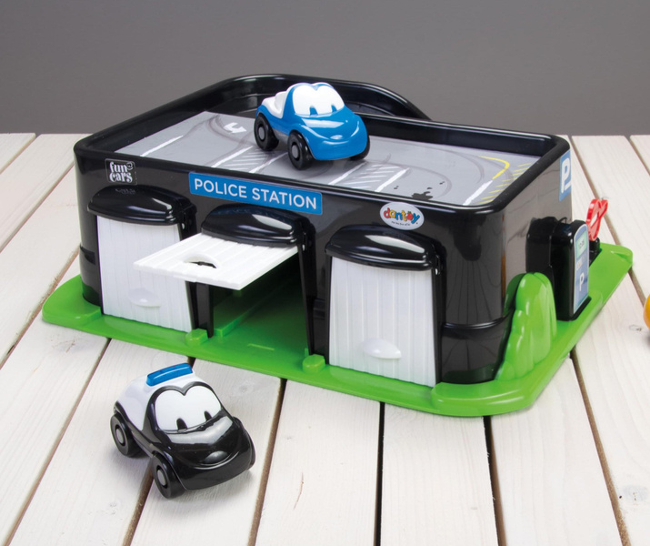 Konstrukcja samochodów wspiera rozwój koordynacji wzrokowo-ruchowej, gdy dziecko kieruje nimi po swoim wyimaginowanym mieście. Intuicyjna konstrukcja pomaga również wzmocnić pewność siebie dziecka, które opanowuje manewrowanie pojazdami i tworzy własne zabawy.Garaż policyjny ze zjeżdżalnią i miejscem na dachu w wyraźnych kolorach dla dwóch policyjnych uroczych autek, które należą do kompletu. Każde auto ma swoje miejsce parkingowe na dachu i w garażu serwisu. Łącznie 3 otwierane bramy, automat wjazdowy i podnoszony szlaban z boku.