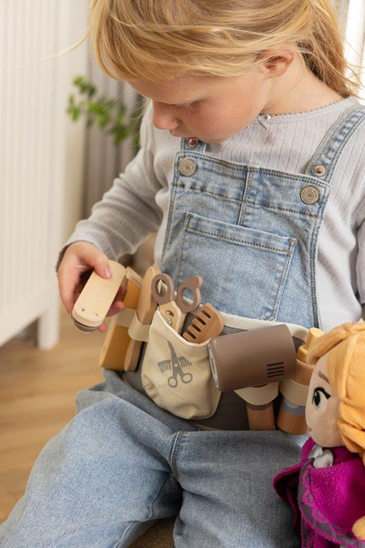Zabawa w fryzjera to świetny sposób na wspólne spędzanie czasu – w domu, u dziadków czy podczas spotkań z przyjaciółmi. Zestaw w wygodnym pasie z kieszonkami można zabrać wszędzie! Zabawki drewniane Dantoy z serii Playful Wood zostały stworzone z myślą o najwyższej jakości, bezpieczeństwie oraz zrównoważonym rozwoju. Zabawki są malowane nietoksycznymi farbami i wykonane z drewna posiadającego certyfikat FSC, co gwarantuje ich pochodzenie z odpowiedzialnych źródeł.