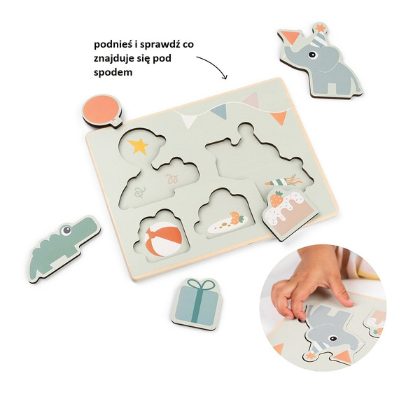 Ta słodka drewniana układanka w postaci puzzli została stworzona specjalnie dla małych rączek, dzięki czemu idealnie nadaje się do wczesnej nauki i zabawy. Każdy zdjęty element pokazuje nową niespodziankę: od ukrytego prezentu po inne zabawne przedmioty czekające na odkrycie.