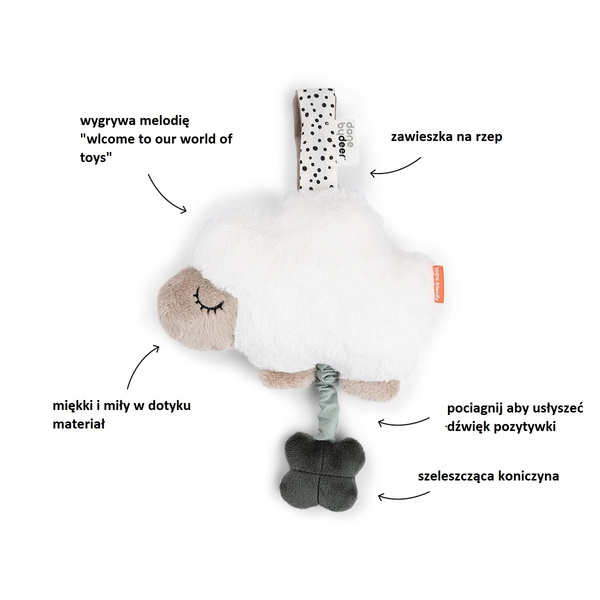 Dzięki delikatnym kolorom i kontrastującym detalom ta zabawka muzyczna oferuje stymulację wizualną, a także rozwija zmysł słuchu. Uroczy kształt owieczki Sheepy sprawia, ze jest to doskonały pomysł na prezent na baby shower! Jedna strona owieczki Sheepy ma otwarte oko, a druga strona zamknięte.