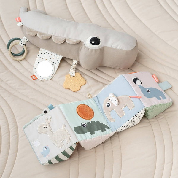Rozkładaną książeczkę sensoryczną można wykorzystać do zabawy na brzuszku, raczkowania lub zabawy na siedząco. Użyj zapięcia na rzep, aby przekształcić ją w sensoryczną kostkę. Elastyczna pętelka pozwala na przymocowanie zabawki do wózka czy maty.