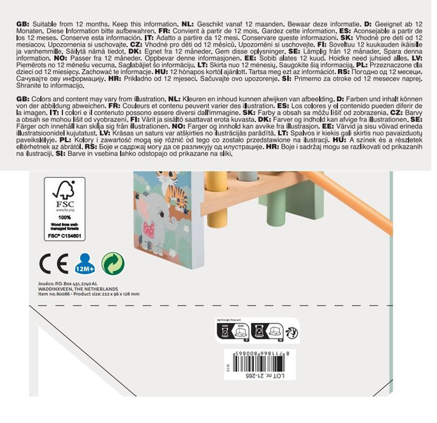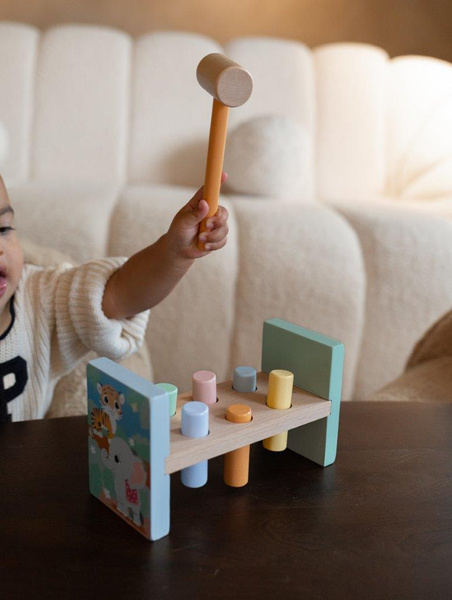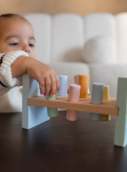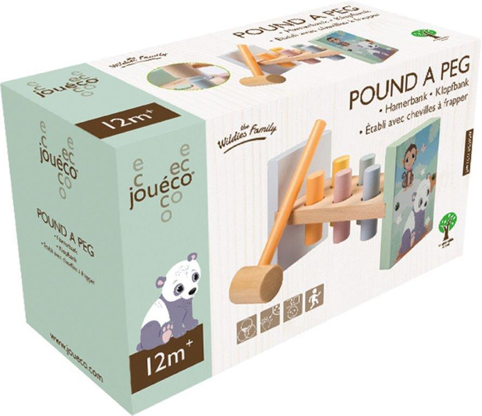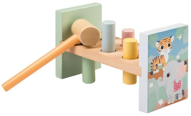 Przebijanka od marki JOUECO to wyjątkowa zabawka, która pomoże Twojemu dziecku rozwinąć najważniejsze w jego wieku zdolności tj.zdolności motoryczne, koordynację ręka-oko i logiczne myślenie. Zabawka składa się z pastelowej drewnianej ławeczki, młotka oraz 6 kolorowych kołków. Należy do pastelowej kolekcji The Wildies Family z wizerunkiem zwierzaków: małpki,słonika, pandy i tygryska.
