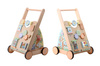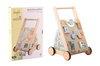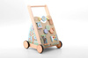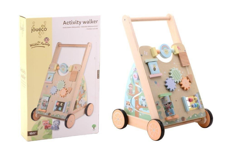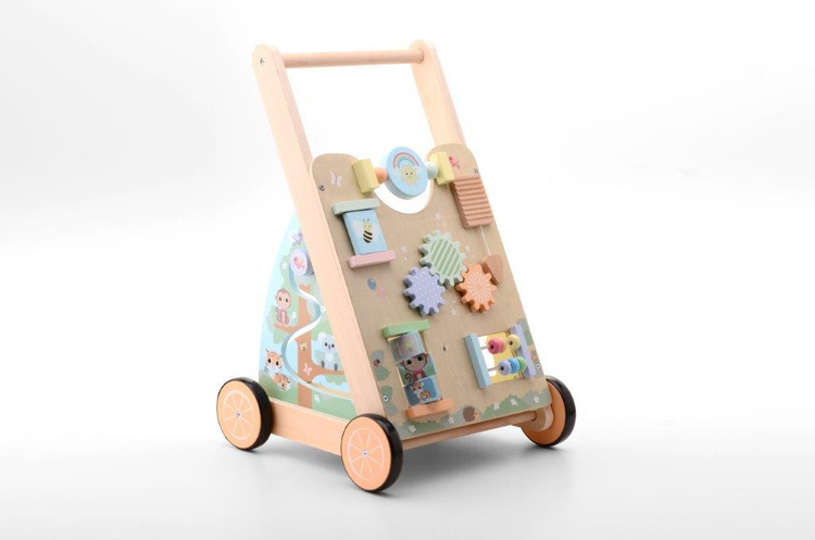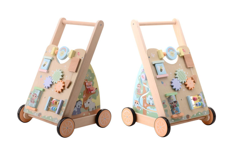 Stabilny chodzik pchacz w pięknych pastelowych kolorach to zabawka,która towarzyszy dziecku przy stawianiu pierwszych kroków jak również edukacyjne centrum rozrywki, które rozwija motorykę dziecka. Pchacz składa się z przedniego panelu i bocznych paneli - każda ze ścian pchacza ma zupełnie inną funkcjonalność i charakter . Pozwala to na bardzo ciekawą zabawę, która nigdy się nie znudzi i będzie stymulowała rozwój malucha: liczydło i klocki, labirynt, ruchome koła i trybiki, ruchoma układanka. Pchacz ma też funkcję pojemnika na zabawki, a dzięki siatce rzeczy są zabezpieczone przed wypadnięciem. Posiada antypoślizgowe koła.