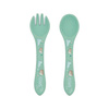 Wygodne i poręczne sztućce w kolorze beżowym z printem, który ozdabia rączki łyżki i widelca, oraz pasuje do kolekcji z leniwcem tej marki, zachęca dziecko do sięgania po kolejne kęsy i zamienia posiłek w radosną przygodę.