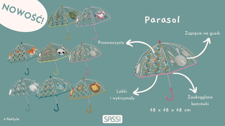 Dziecięcy parasol przeciwdeszczowy włoskiej marki SASSI dla przedszkolaka jest przezroczysty, bardzo lekki i gwarantuje radość z deszczu. Zaprojektowany z myślą o najmłodszych to idealny towarzysz na deszczowe dni.