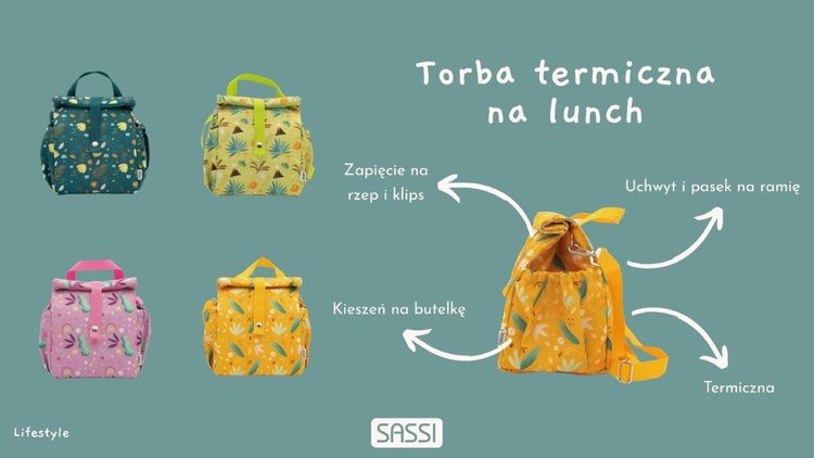 Warstwa termoizolacyjna wewnątrz torby pomaga utrzymać optymalną temperaturę jedzenia przez kilka godzin, a trwały materiał chroni zawartość przed zabrudzeniami i wilgocią. Kolorowy wzór pasujący do linii zwierzaków z kolekcji SASSI sprawi, że każdy posiłek zamieni się w ekscytującą przygodę!