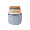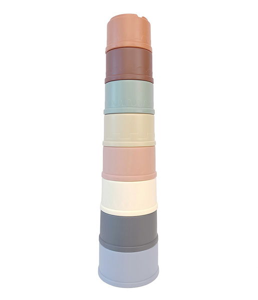 Zestaw składa się z 8 kolorowych kubeczków o różnej wielkości, które można układać jeden na drugim, wkładać jeden w drugi oraz używać do przelewania wody.
