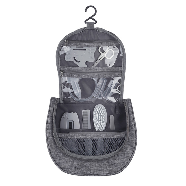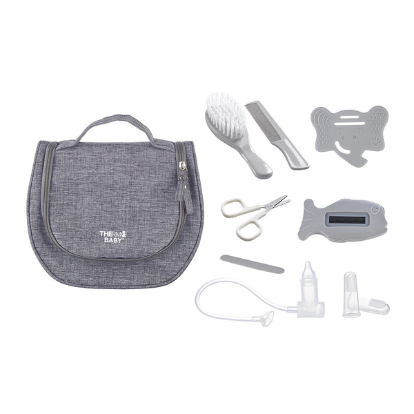 W zestawie: kosmetyczka, szczotka i grzebień, gryzak, nożyczki, termometr do kąpieli, pilniczek do paznokci, aspirator manualny, szczoteczki silikonowe na palec.