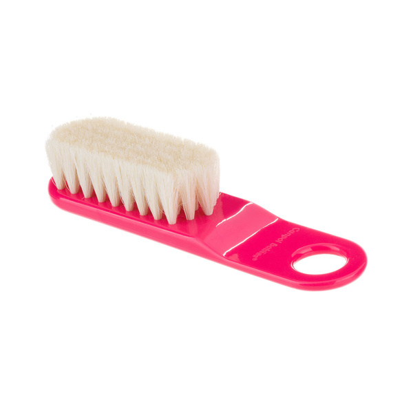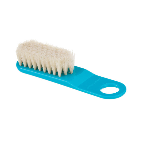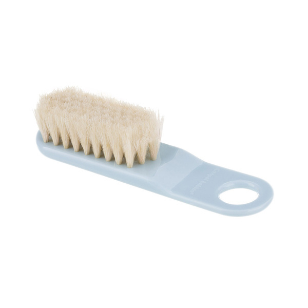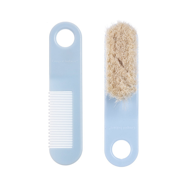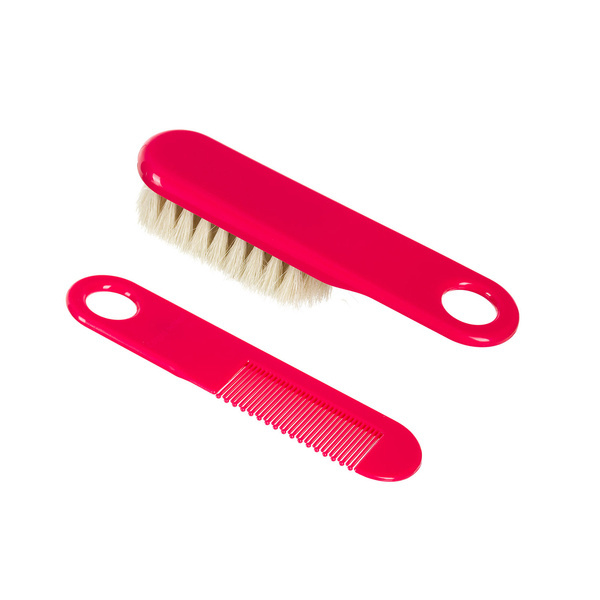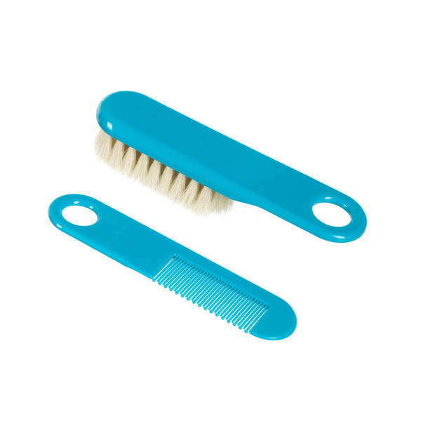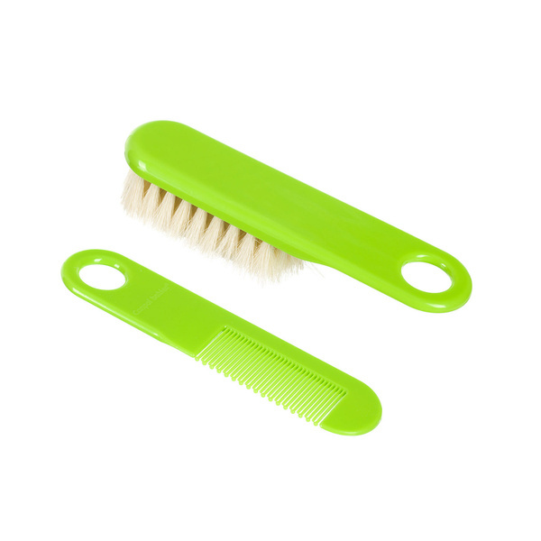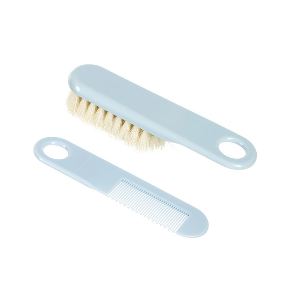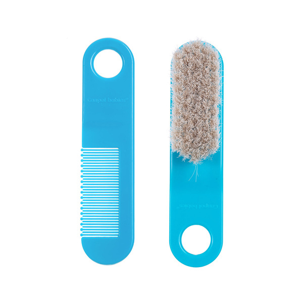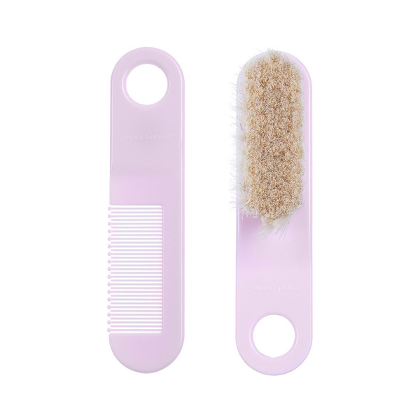 Szczotka do włosów z naturalnego, miękkiego włosia w zestawie z grzebykiem do codziennej pielęgnacji włosów dziecka. Grzebień posiada zaokrąglone ząbki, które nie podrażniają wrażliwej skóry malucha. Szczotka delikatnie masuje główkę dziecka, nie elektryzując włosów. Idealna od pierwszych dni po urodzeniu.