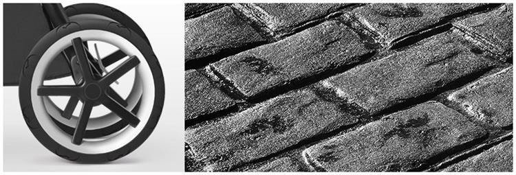Duże, nieprzebijalne koła, które wypełnione są gumą, gwarantują naprawdę komfortową jazdę w każdych warunkach. Są mobilne, obrotowe i posiadają wysoką amortyzację, dzięi temu wózkiem można wjechać na każdy krawężnik.