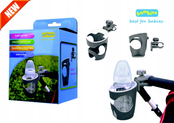 Łatwe mocowanie do większości wózków. Uchwyt utrzymuje napoje w pozycji pionowej i zapobiega rozlaniu.