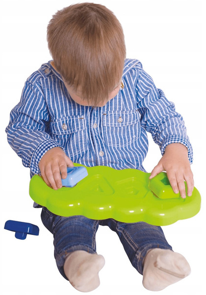 Zzabawka składa się z transparentnego pudełka oraz kolorowej nakładki z 4 kształtami + 20 elementów w różnych kolorach i kształtach, które należy dopasować do podstawki
