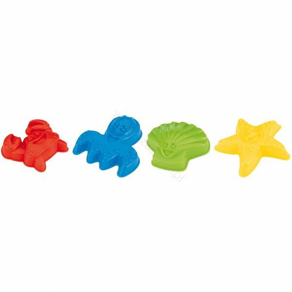 w zestawie znajdują się foremki o kształtach: ośmiornicy, kraba, muszelki i rozgwiazdy