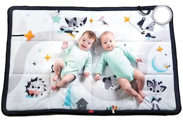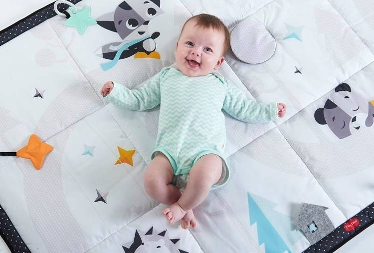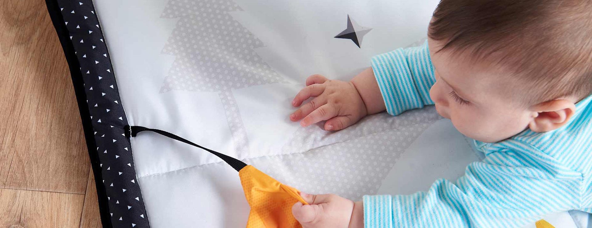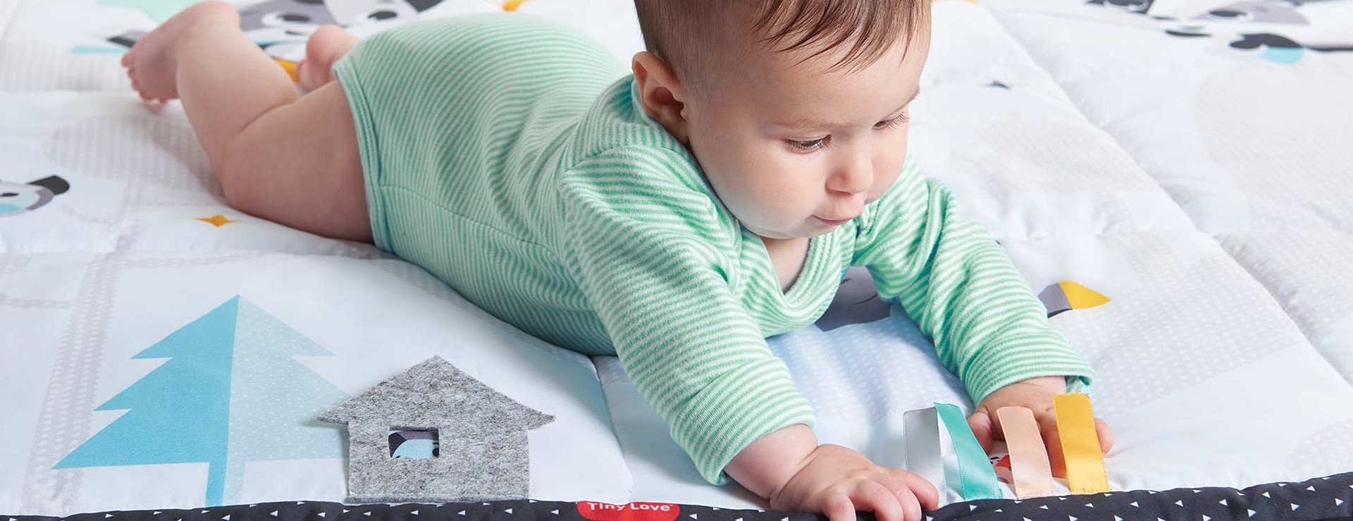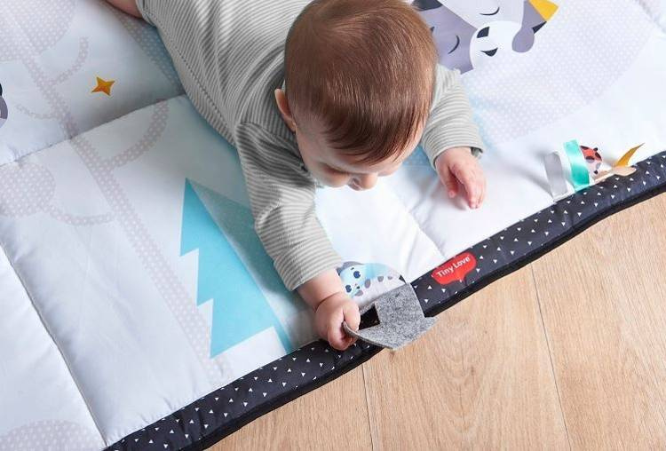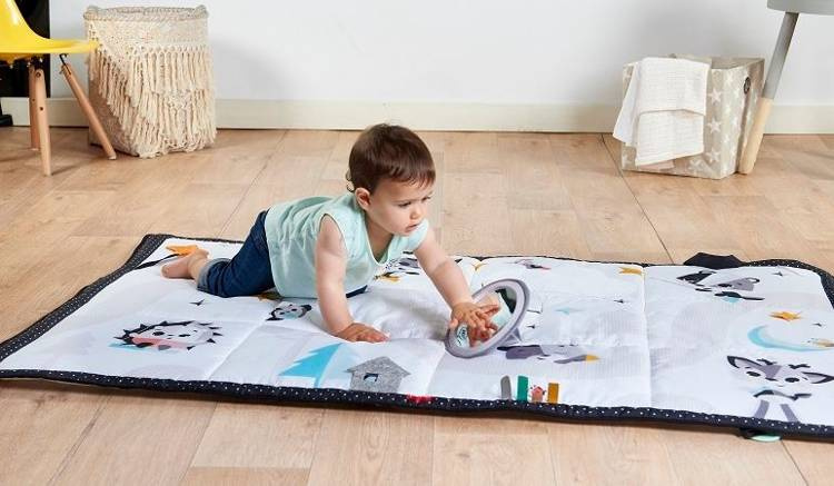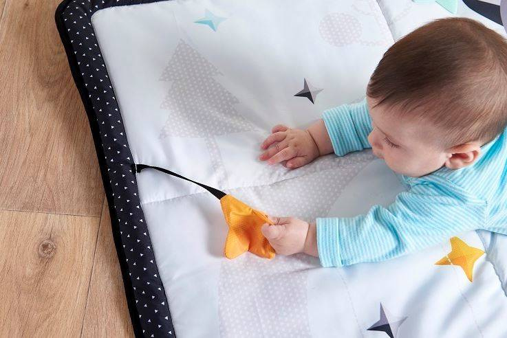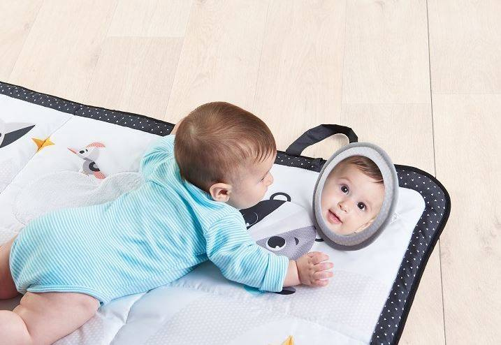Zachęcaj dziecko do leżenia na brzuszku, angażując dziecko jedną z funkcji i elementów maty. Skieruj wzrok maluszka się na ilustracje maty, zwróć jego uwagę na satynowe wstążki i drzewko a ku-ku lub umieść lusterko pod odpowiednim kątem, aby dziecko mogło zbadać w nim swoje odbicie.