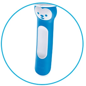 Osłonka przy szczoteczce zabezpiecza przed nieprawidłowym włożeniem szczoteczki do buzi dziecka.