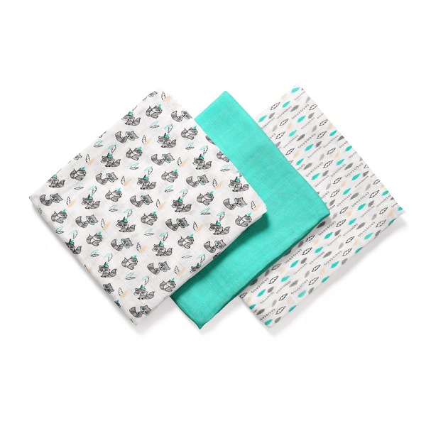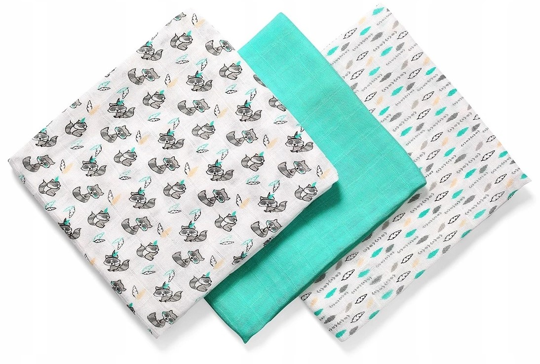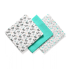 Zestaw zawiera 3 sztuki pieluszek: 2 sztuki są zdobione kolorowymi nadrukami, trzecia jest barwiona jednolicie.