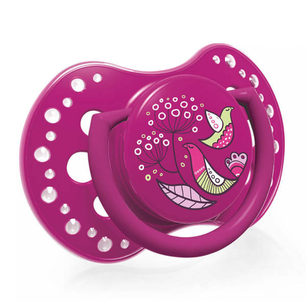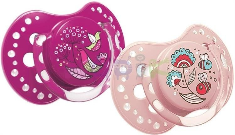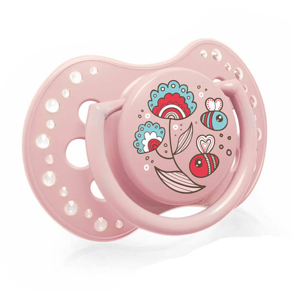 Tarczka smoczka posiada wypustki, dodatkowo wyprofilowano ją w taki sposób by dziecko nie miało problemów z oddychaniem.