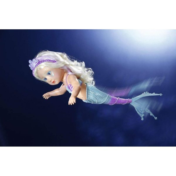 Włóż lalkę głową do wody, tak by jej brzuch był zanurzony prędzej niż ogon by ten zaczął się ruszać, w ten sposób lalka może pływać samodzielnie!