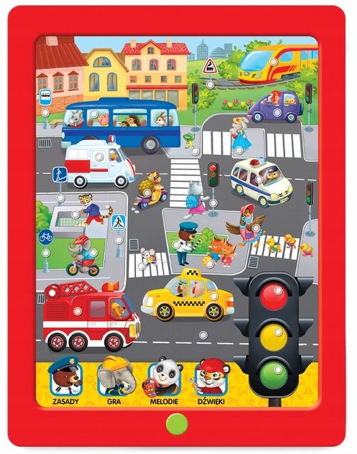 Tablet, który uczy najmłodszych zasad panujących na drodze. Do wyboru jest kilka trybów zabawy. Można naciskać poszczególne obrazki, aby usłyszeć ich nazwę, realistyczny dźwięk lub wybrać tryb GRA, aby usłyszeć pytanie, na które należy odpowiedzieć poprzez naciśnięcie odpowiedniego obrazka. W trybie MELODIE dziecko może posłuchać wesołych melodii.