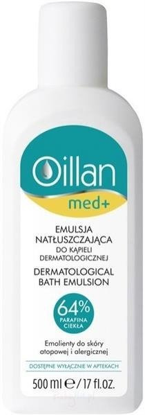 Emulsja natłuszczające do kąpieli dermatologicznej Oillan przeznaczona do stosowania dla skóry swędzącej, podrażnionej, chronicznie suchej, ze zdiagnozowanymi dermatozami (AZS, alergiczne kontaktowe zapalenie skóry, łuszczyca, "rybia łuska", egzemy).