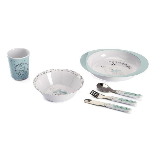 Talerzyk, miska i kubek przeznaczone są dla dzieci powyżej 6 miesiąca życia, natomiast sztućce powyżej 12 miesiąca życia.