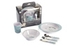 W skład zestawu wchodzi talerzyk, miseczka, kubek oraz po jednej sztuce widelca, łyżki i noża. Każdy z elementu zestawu ma na sobie ładny print.