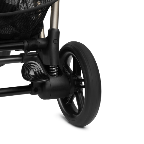 Dzięki amortyzacji w kołach wózka, nie musimy obawiać się niewygodnego prowadzenia, albo dyskomfortu dla dziecka, kiedy poruszamy się po nierównej nawierzchni. Do tego gumowe nakładki na koła przedniej osi dodatkowo wzmacniają trwałość kół