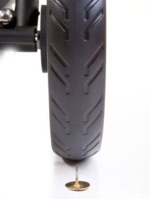 Koła ze specjalnego tworzywa EVA z bieżnikiem przypominają pompowane, jednak ich zaletą jest to, że nie przebiją się, więc bez obaw można spacerować po kamienistych drogach.