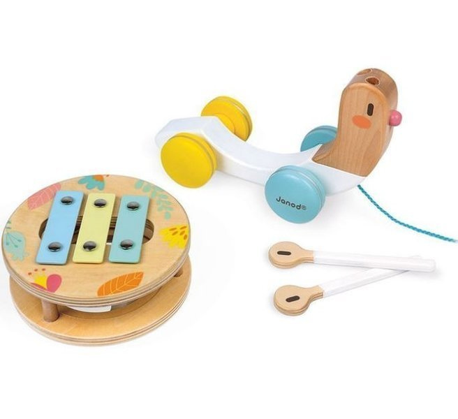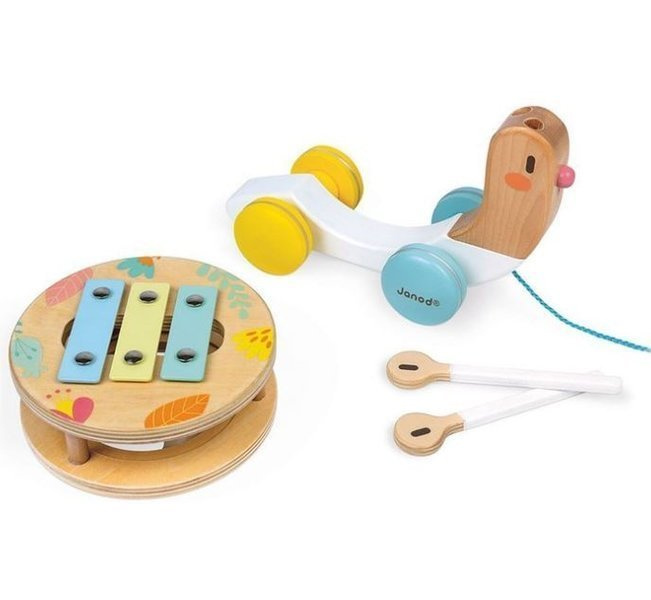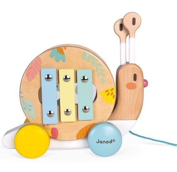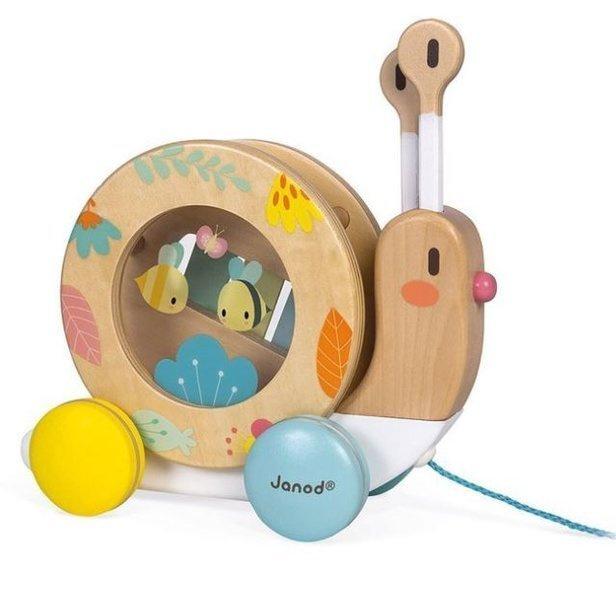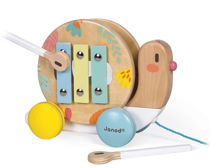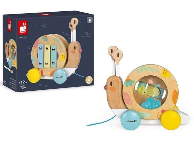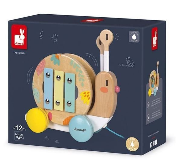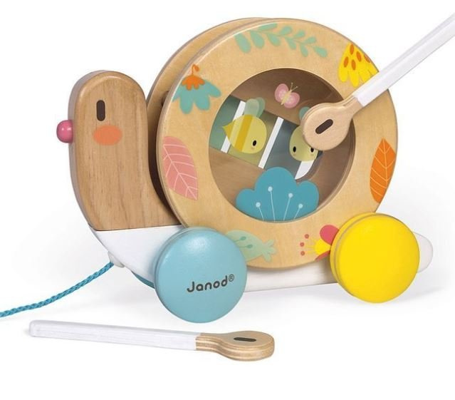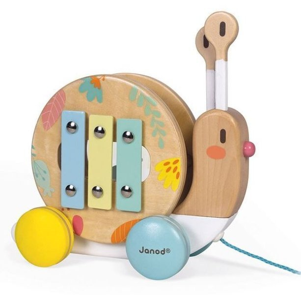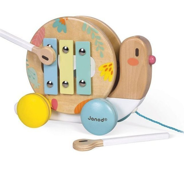 Janod Drewniany Ślimak Do Ciągnięcia z Cymbałkami i Bębenkiem Pure